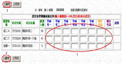 [設定成績比率]步驟2說明: 1、 輸入比率 2、點按【1.儲存】鈕 |
