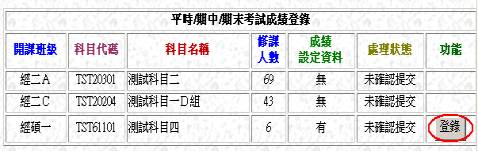 [平時/期中/期末成績登錄] 步驟2說明: 選擇 欲登錄之科目,按【登錄】鈕 |