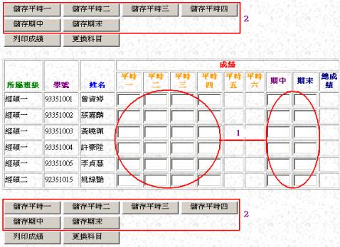 [平時/期中/期末成績登錄] 步驟3說明: 1、於 [成績] 欄,輸入成績 2、欲存檔成績,請點按 【儲存平時一】鈕∼ 【儲存期末】鈕 舉例:欲儲存[平時一]之成績,請點按【儲存平時一】鈕。依此類推。 |