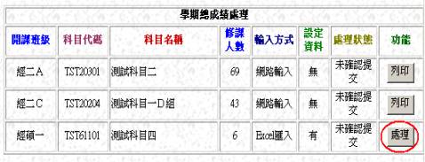 [學期總成績處理]步驟2說明: 選擇 欲處理之科目,按【處理】鈕 |